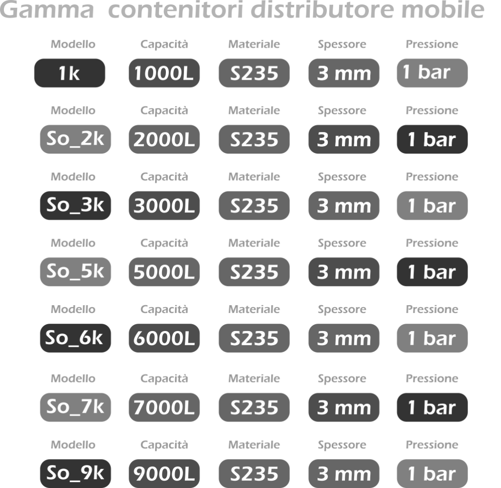 I serbatoi possono avere una capienza che va dai 1000 ai 9000 lt. Sono realizzati in acciaio al carbonio, con diametro 400 con coperchio imbullonato e guarnizione, completo di ghiera e tappo con attacco rapido di carico da 3″ lucchettabile.